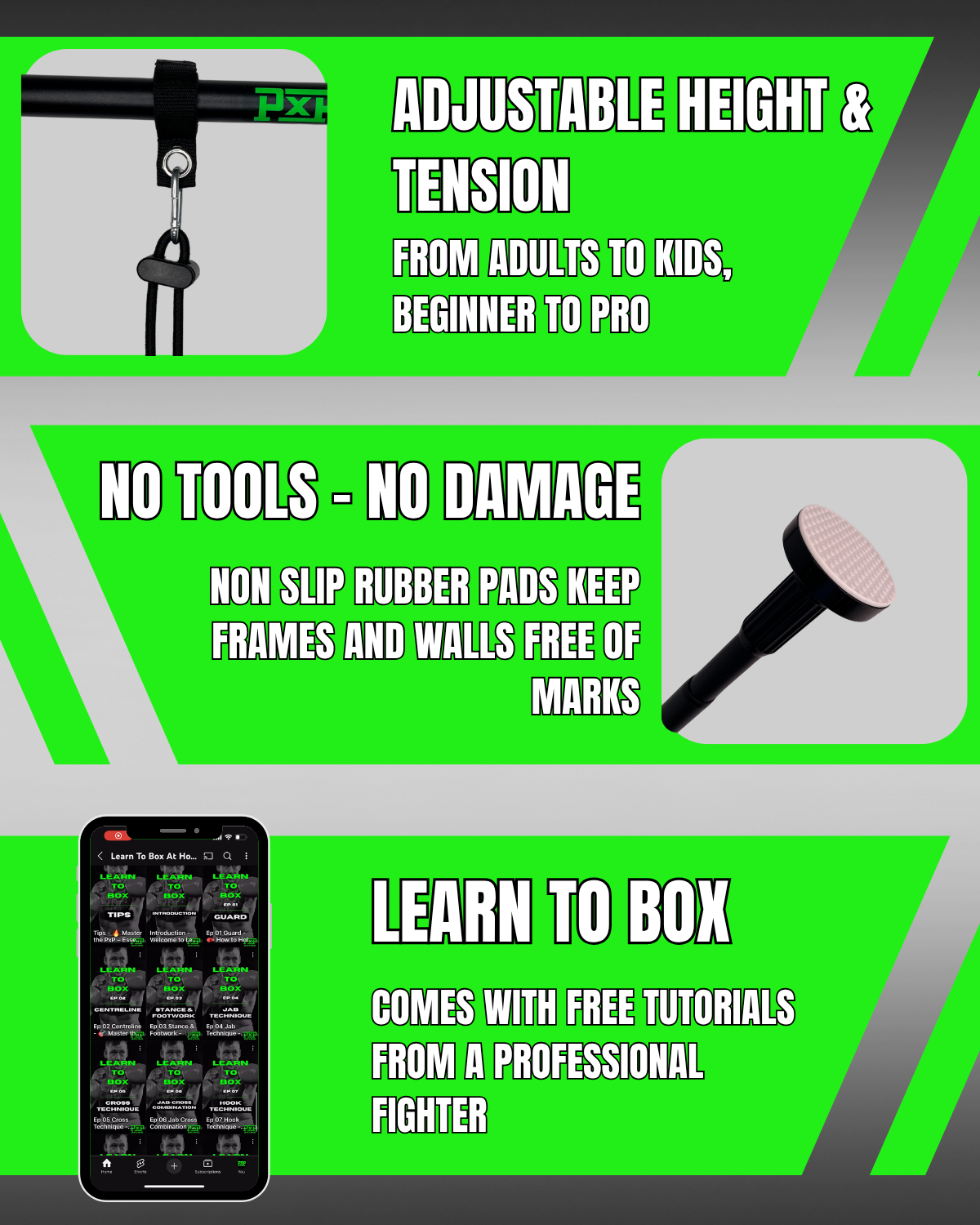 The PunchX Pro is the world’s first fully adjustable, tool-free floor-to-ceiling ball system that fits securely into almost any doorway.